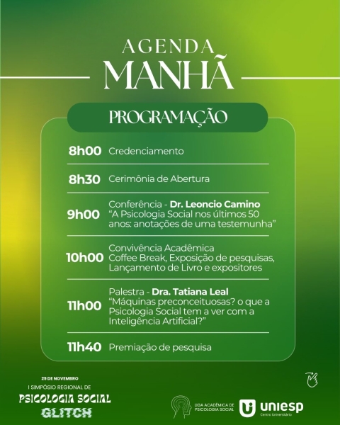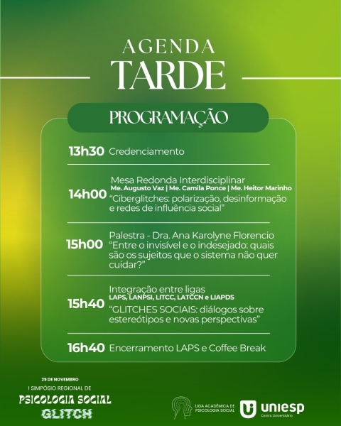 No próximo sábado, 29 de novembro, o UNIESP Centro Universitário receberá o I Simpósio Regional de Psicologia Social. O evento é uma iniciativa da Liga Acadêmica de Psicologia Social - LAPS da instituição e tem como tema “GLITCH: o ser humano falhando no meio social automatizado”.
