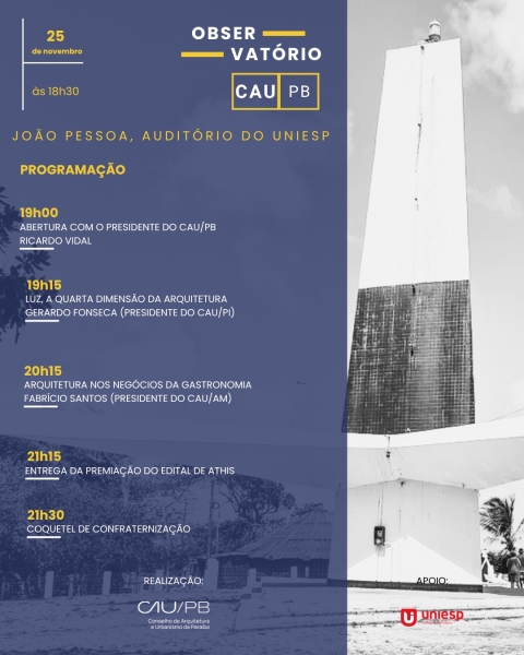 O UNIESP Centro Universitário recebe, nos dias 25 e 26 de novembro, o Observatório João Pessoa do Conselho de Arquitetura e Urbanismo da Paraíba (CAU/PB). O evento é gratuito e destinado a arquitetos e urbanistas e estudantes da área.