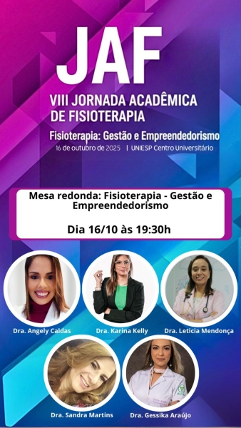 - Mesa redonda: Fisioterapia - Gestão e Empreendedorismo - com Angely Caldas, Karina Kelly, Letícia Mendonça, Sandra Martins e Géssika Araújo 19h30-20h30