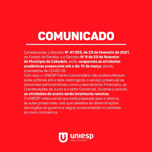 Com isso, o UNIESP Centro Universitário não poderá oferecer aulas práticas até a data, restringindo o serviço presencial às demandas administrativas, como o atendimento Financeiro, as Coordenações de curso e o setor Comercial. Durante o período, as atividades de ensino serão totalmente remotas.