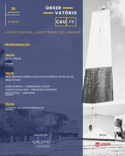 No dia 26, acontecerá a mesa redonda “O Uso da Inteligência Artificial na Arquitetura” com participação do conselheiro Jaime Alheiros, do Conselho de Arquitetura e Urbanismo de Pernambuco, do professor Thiago Cavalcanti, e mediação de Igor Aciolly, assessor jurídico do CAU/PB.